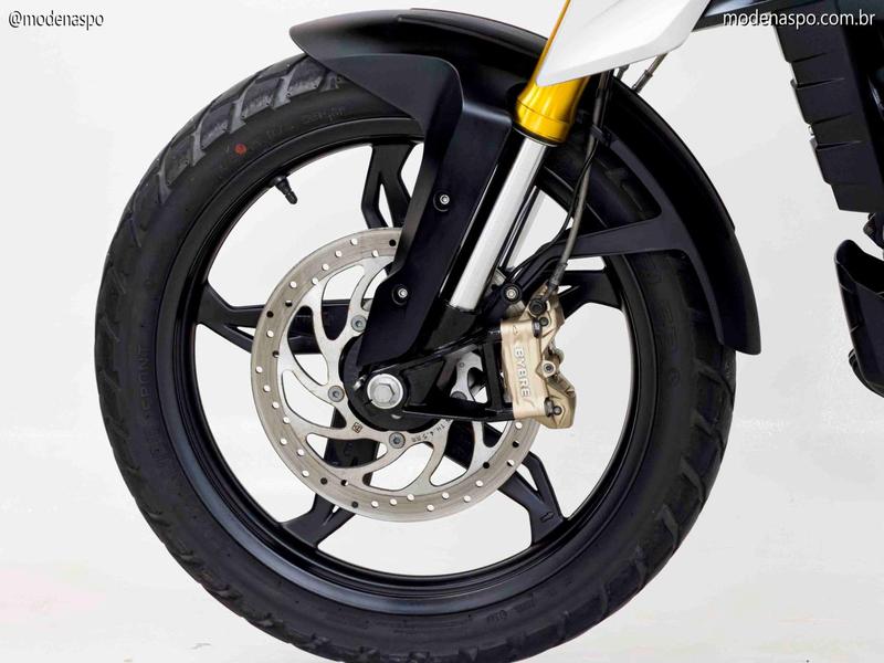 Suspensão de Longo Curso: Com 180 mm de curso em ambas as rodas e suspensão dianteira invertida, a G 310 GS absorve buracos e irregularidades com facilidade, oferecendo um nível de conforto acima da média para a categoria.