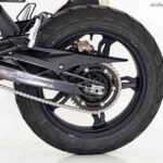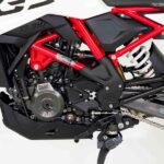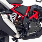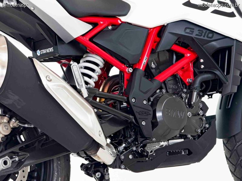Motor com Cilindro Invertido: O motor de 313 cc possui a admissão na frente e o escape atrás, permitindo que o conjunto seja inclinado para trás. Isso centraliza a massa, melhora o centro de gravidade e resulta em uma pilotagem mais ágil.