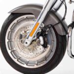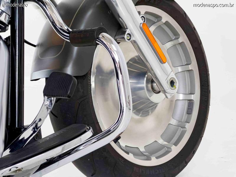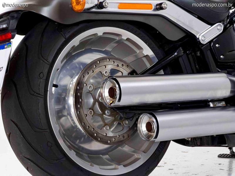 Rodas Lakester de Disco Sólido: Talvez o elemento visual mais marcante da Fat Boy. As rodas de alumínio fundido são fechadas e imponentes, calçadas com os pneus mais largos já oferecidos pela Harley em uma moto de série: 160 mm na dianteira e 240 mm na traseira.