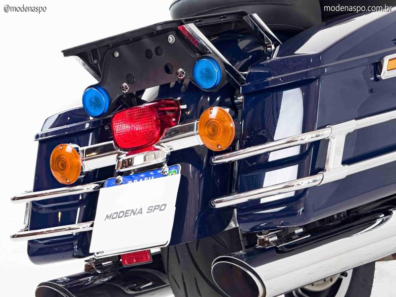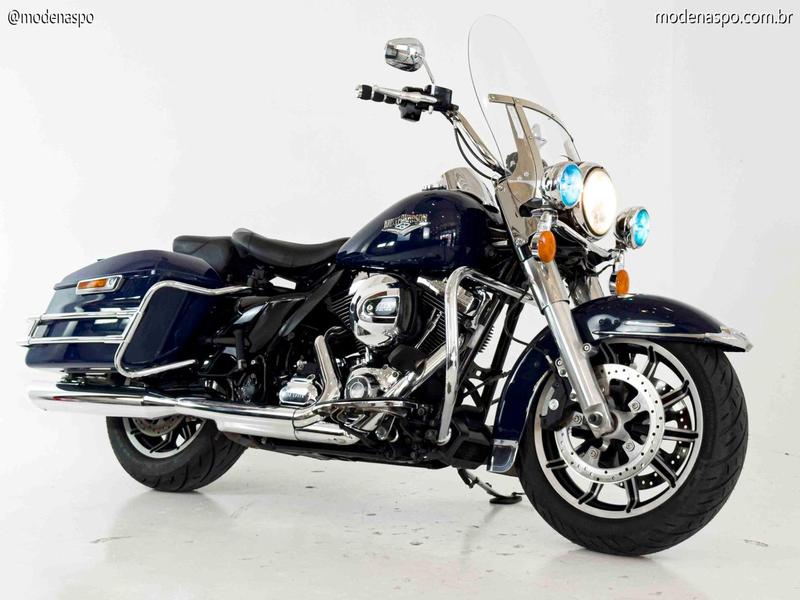 A Harley-Davidson Road King Police FLHP 2015 é uma versão especial da icônica Road King, projetada originalmente para uso por forças policiais. Embora compartilhe a base mecânica e o estilo touring clássico da versão civil, a FLHP possui características exclusivas, como um banco individual (solo seat) com sistema de amortecimento a ar ajustável para maior conforto do oficial, sirenes e luzes de emergência (que podem ser desativadas/removidas para uso civil), e uma calibração de motor focada em durabilidade e torque em baixa rotação. É uma máquina imponente, robusta e com um visual único.