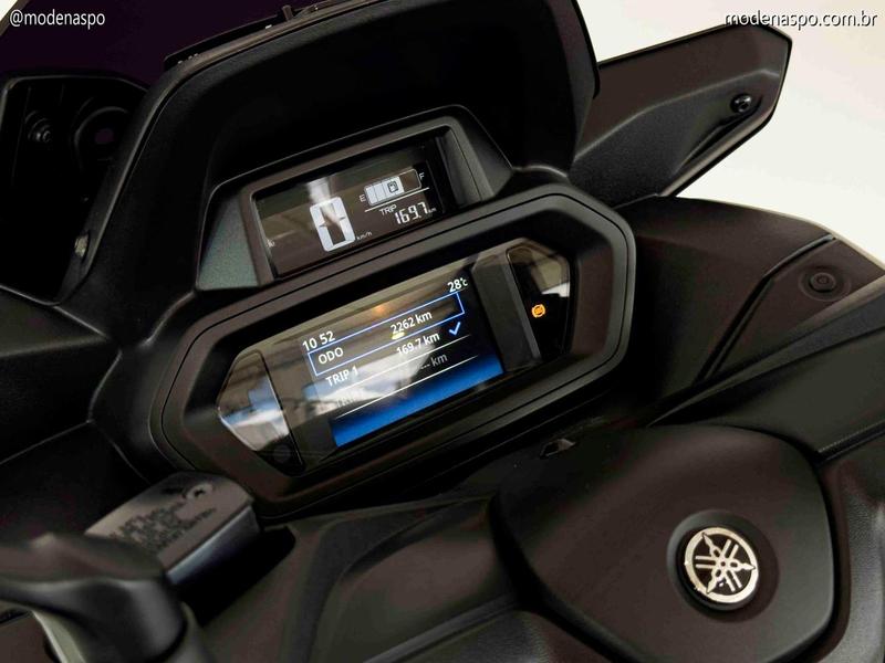 Painel TFT Colorido com Conectividade: O grande destaque é o painel de instrumentos composto por uma tela TFT de 4,2 polegadas colorida e uma tela LCD de 3,2 polegadas. Ele permite parear o smartphone via Bluetooth através do aplicativo Yamaha Motorcycle Connect, exibindo notificações de chamadas, mensagens e e-mails.